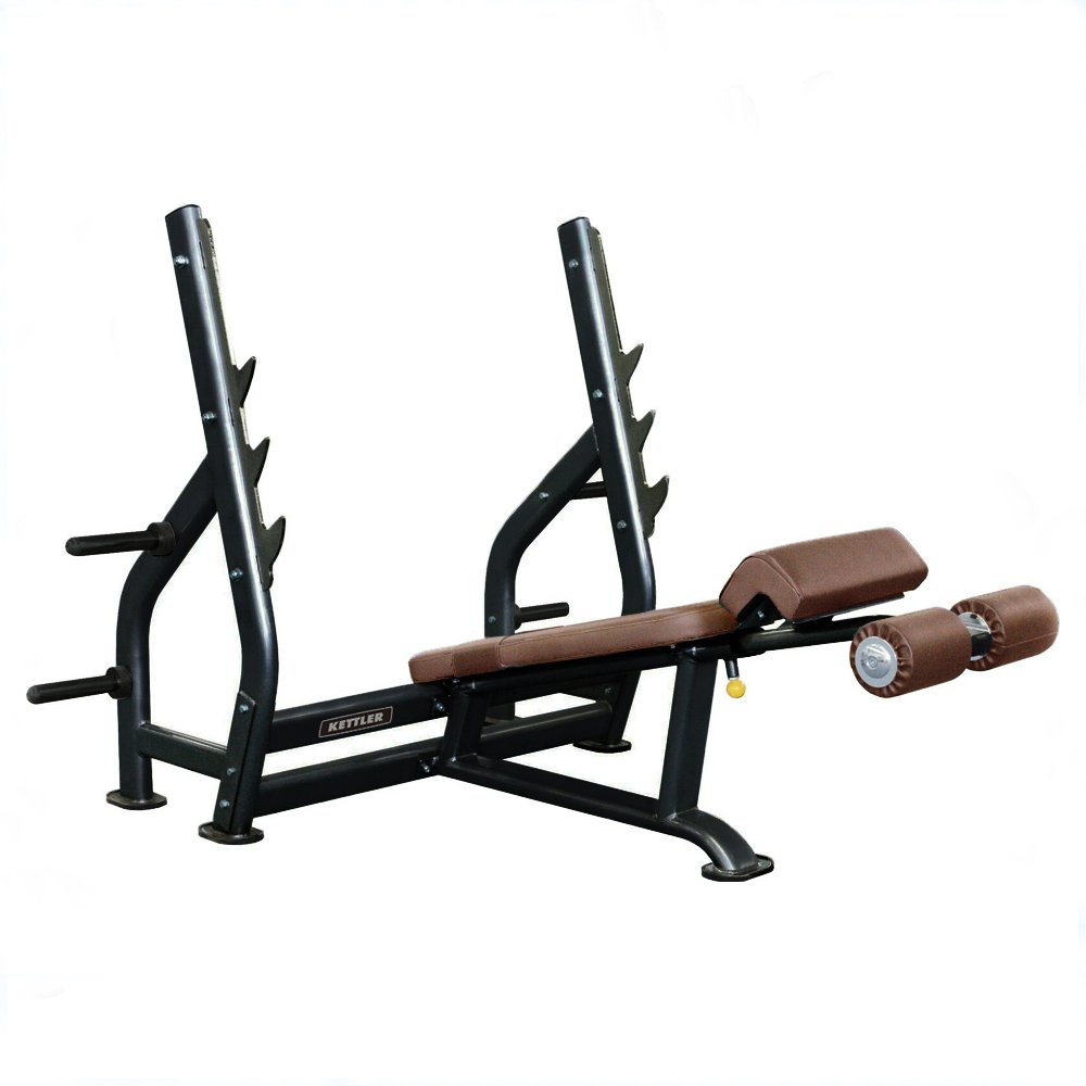 The KETTLER 07970-416 Decline Bench Press from the EDITION SERIES is designed for high level professional use, The 07970-416 is pin selectorized equipment for mainly working out the pectoralis major muscle. Three-level limit gear plate on the instrument accommodates users with varying wingspans. Many procedures are used to give the gear plate durability, resistance to corrosion, and gloss. Users are well-supported by the thicker and wider cushions and rollers.